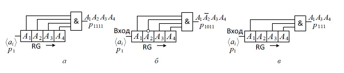 Последовательно формируемые случайные отсчеты …, принимающие двоичные значения, объединяются конъюнкцией в группы, образующие сложные события (6) и/или (7), с учетом задержек между ними и инверсий. Варианты аппаратного формирования событий 4-го порядка представлены на рис. 3. Образование произведения элементарных переменных в прямой форме показано на рис. 3 а. Участие элементарных переменных в сочетании прямой и инверсной форм изображено схемой на рис. 3 б. Пример формирования неплотного набора элементарных переменных в прямой форме путем добавления задержки между первой и третьей переменными представлен на рис. 3 в для начального момента 3-го (частного) порядка.