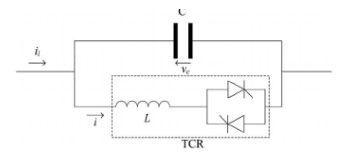 Схема TCSC приведена на рис. 1. Это устройство может быстро изменять реактивное сопротивление линии передачи и изменять поток энергии в линии передачи. Работа TCSC может быть объяснена с помощью анализа цепей. TCR (рис.2) – индуктивное реактивное сопротивление, контролируемое углом зажигания [6].