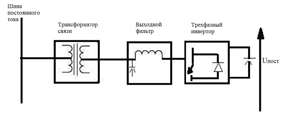 STATCOM включает в себя трехфазный инвертор, основанный на биполярных транзисторах с изолированным затвором, конденсатор постоянного тока, который обеспечивает напряжение постоянного тока для инвертора, связующий реактор, который связывает выход инвертора со стороной источника переменного тока, а также трансформатор связи устройства с сетью высокого напряжения. Состав STATCOM представлен на рис. 3. На стороне конденсатора трехфазное напряжение генерируется инвертором, а фаза синхронизируется с источником питания со стороны переменного тока [9–11].