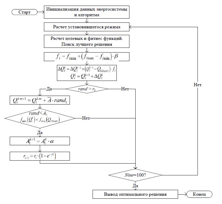 Современные энергосистемы характеризуются динамичным изменением всех входящих в них компонентов: появляется большое количество крупных промышленных потребителей, производятся регулярные работы по вводу в работу нового или модернизации старого израсходовавшего свой ресурс оборудования, разрабатываются новые концепции по созданию и управлению энергосистемами. Все эти действия приводят к значительному усложнению топологии энергосистем, а также к повышению трудоемкости проектирования новых и диспетчеризации имеющихся систем. При увеличении нагрузок увеличиваются системные потери и значительно ухудшается профиль напряжения во всех узлах энергосистемы. Электрическая энергия постоянно рассеивается в электрических сетях на уровнях передачи и распределения. Потери мощности в распределительной сети из-за более низкого уровня напряжения и более высокого отношения активного сопротивления к реактивному по сравнению с уровнем магистральных сетей являются более значительными. Кроме того, потери мощности вынуждают электрические станции придерживаться большей генерации активной и реактивной мощностей, что приводит к повышенному использованию топлива и росту тарифов для конечного потребителя. В сложившейся ситуации использование традиционных методов для нахождения оптимальных условий работы энергосистем становится неэффективным. Наибольшую популярность для решения подобных проблем приобрели эвристические, а затем и метаэвристические оптимизационные методы, способные найти решение, близкое к глобальному оптимиуму. В статье представлено решение проблемы оптимизации уровней напряжения в энергосистеме с помощью метода поиска летучей мыши и выполнено сравнение полученных результатов с методом оптимизации роя частиц. Рассматриваемый метод показал более высокие оптимизационные качества, что свидетельствует о его пригодности для решения подобных задач.