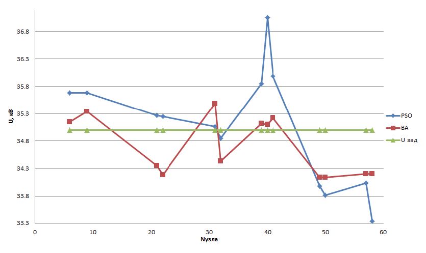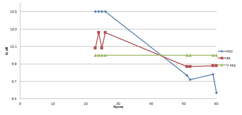 По полученным графикам видно, что после выполнения всех итераций фитнес-функция алгоритма поиска летучей мыши имеет меньшее значение по сравнению с методом роя частиц. Значения напряжений в большинстве узлов энергосистемы по методу поиска летучей мыши отклоняются от заданных значений на меньшую величину по сравнению с другим рассматриваемым методом.