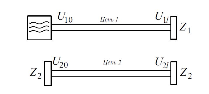 Данные величины можно определить из рис. 1, на котором показаны влияющая цепь 1 и подверженная влиянию цепь 2; остальные, как их принято называть, третьи цепи не показаны на рисунке. Цепи 1 и 2 замкнуты на свои волновые сопротивления Z1 и Z2. Напряжение  на ближнем к передатчику конце линии, подверженной влиянию, называется напряжением влияния на ближний конец, а напряжение   на дальний конец [2, 3].