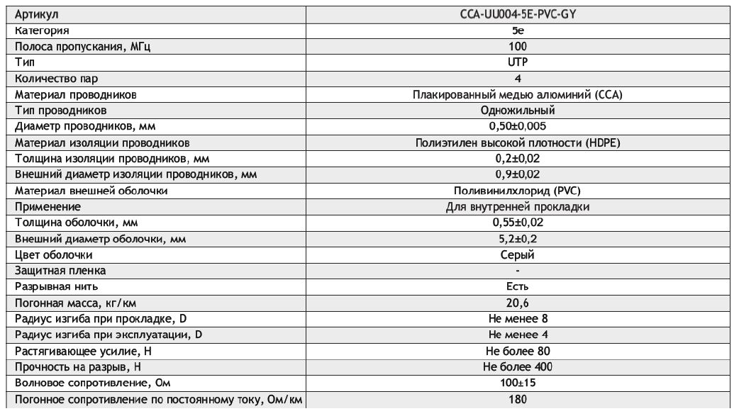 Рис.2. Характеристики кабеля CCA-UU004-5E-PVC-GY