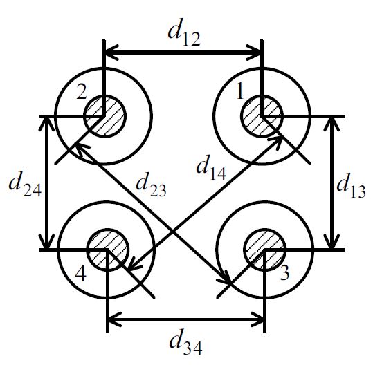 Для связи коэффициентов К1, К2, К3 с диаметром изоляции нужно выразить данные коэффициенты через межосевые расстояния жил в четверке . Согласно [1, 10, 11, 12, 13] коэффициенты емкостной связи будут равны