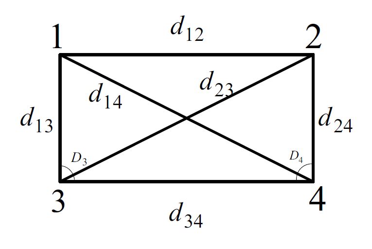 и   межосевое расстояние между жилами; 1, 2, 3, 4  жилы;  и   углы между межосевыми расстояниями  и  соответственно.