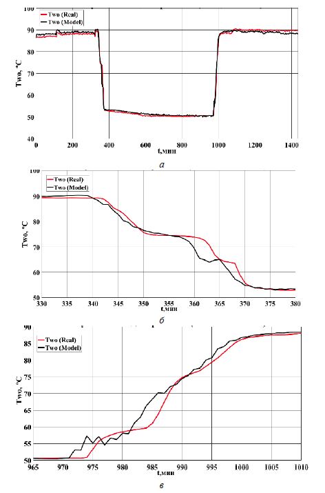 На рис. 9 приведены результаты моделирования при подаче на вход нейронной сети внешних воздействий, взятых из выборки № 2. Данные выборки № 2 относятся к режиму «Разгон». Для выборки характерны следующие диапазоны изменения входных параметров: расход сетевой воды 420–450 м3/час, температура сетевой воды на входе 50–52 °С, давление газа -0,2–0,7 кПа, температура газа 0–510 °С. На рисунке приведен результат моделирования как на всем диапазоне изменения, так и на участке разгона.