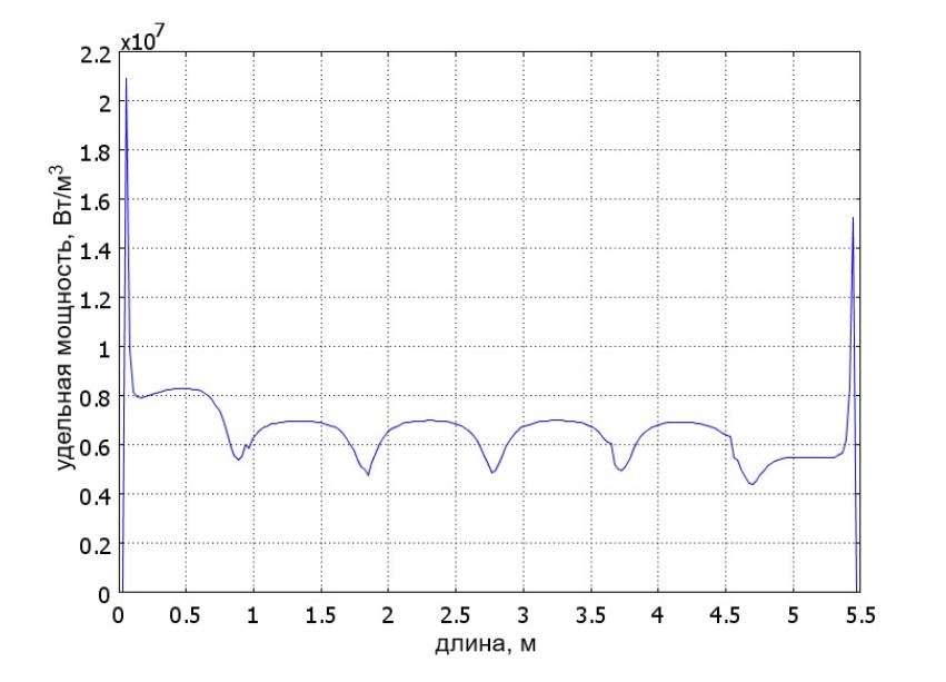 В результате при периоде выдачи заготовок, равном 20 минут, получены диаграммы температуры по длине всей загрузки (6 заготовок), которые представлены на рис. 3. Токи в одновитковых индукторах: в первом 200 кА, во втором – пятом 180 кА, в шестом 161 кА. Токи подобраны для обеспечения одинаковой мощности во всех заготовках. Мощность тепловыделения в заготовках имеет значения от 172 до 200 кВт.