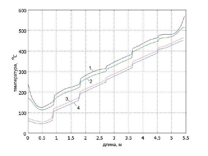 Рис. 3. Диаграммы температур в загрузке при программном управлении нагревом: 1 – на поверхности при t=7200 c; 2 – на поверхности при t=7300 c; 3 – на осевой линии при t=7300 c; 4 – на осевой линии при t=7200 c