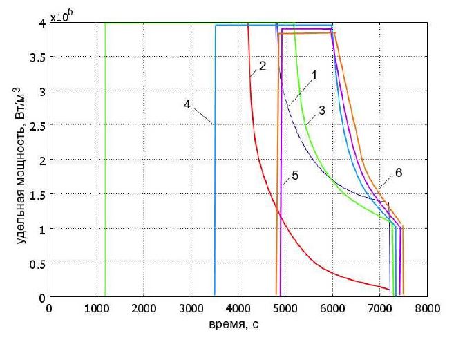 Рис. 5. Временные диаграммы мощности тепловыделения каналов регулирования для итогового варианта параметров