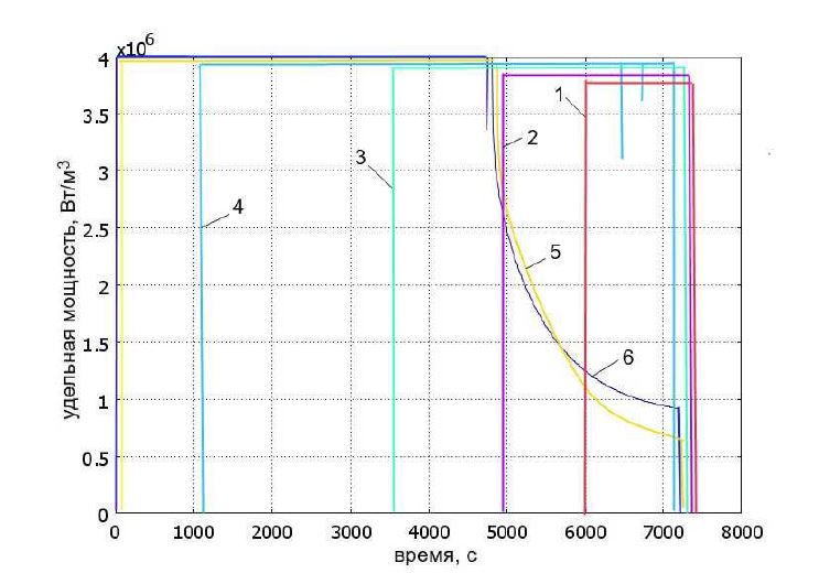 Расчет значений уставок для каждой секции произведен на основании многократного повторения вычислительной процедуры. Исходное соотношение уставок температур для каналов регулирования принято равномерно возрастающим от 100 до 500 градусов. Исследование диаграмм температуры во всей загрузке и в заготовке на выходе из индуктора показывает, каково отклонение от заданного распределения. Последовательное увеличение уровня уставок до предельного значения 500 градусов во всех каналах не дало преимуществ в достижении заданного распределения. Сравнение временных диаграмм изменения удельной мощности всех каналов регулирования для варианта с максимальными уставками (рис. 4) и варианта с плавно возрастающими уставками (рис. 5) показало, что в первом случае первые четыре индуктора работают на полную мощность часть времени, а потом переходят в режим стабилизации температуры поверхности, а оставшиеся два служат для выравнивания температуры и потребляют меньшую мощность. Такой режим не оставляет резерва системе регулирования в случае внешних возмущений, например кратковременных остановов процесса нагрева.
