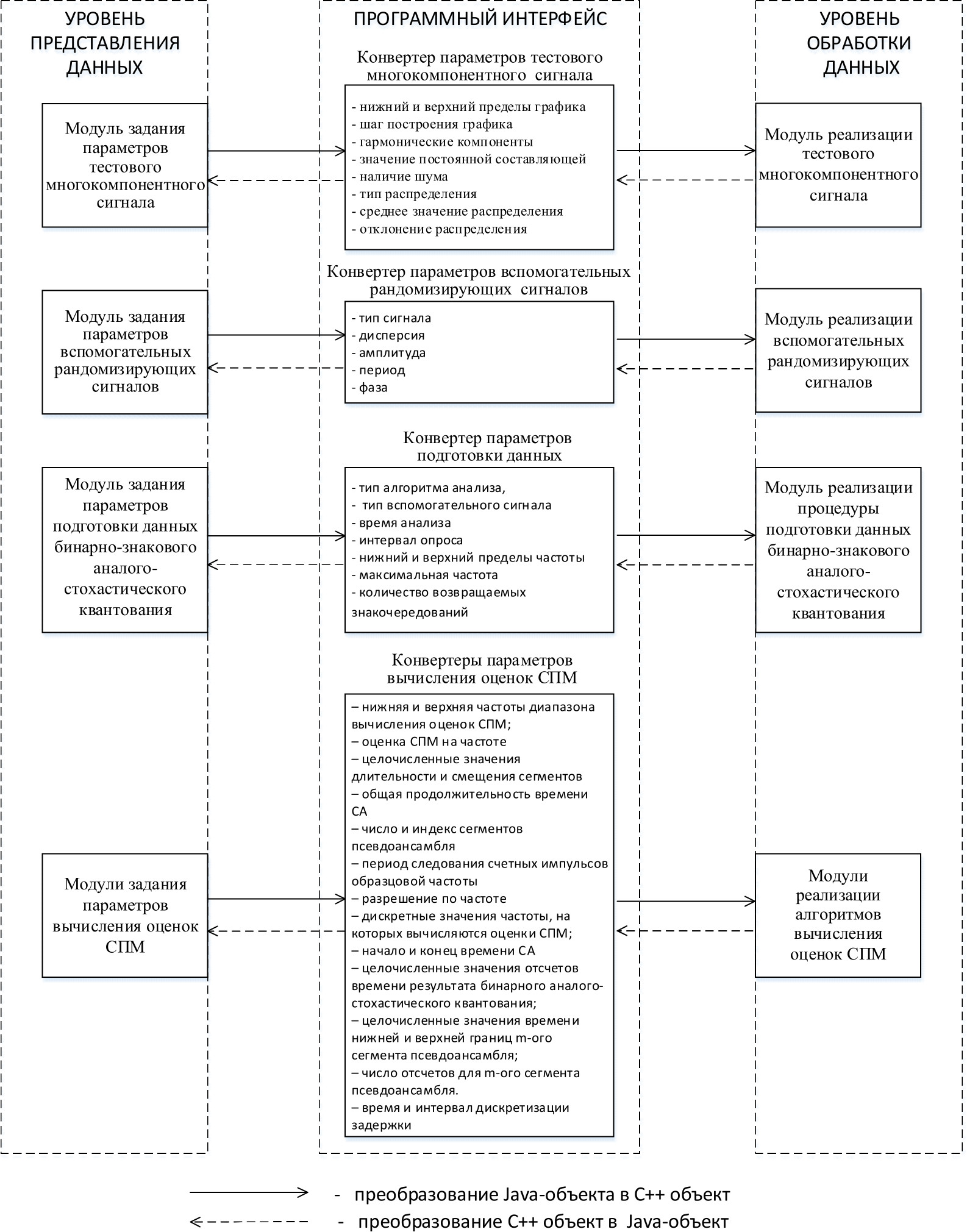 Уровень представления реализован на строго типизированном объектно-ориентированном языке программирования Java, а уровень обработки, хранения и передачи измерительной информации – на статически типизированном языке программирования общего назначения С++. Использование языка Java обеспечило создание программных конструкций с возможностью повторного использования с минимальными модификациями или без них на самых различных компьютерных платформах, что повышает мобильность метрологически значимого ПО. Так как при цифровой обработке сигналов периодически используется четко определенный набор математических инструментов с небольшими вариациями параметров, то модульность C++ имеет значительные преимущества в программировании приложений цифровой обработки сигналов. Структуры данных C++ позволяют разрабатывать подпрограммы и объекты внешних библиотек, которые можно использовать в качестве строительных блоков ИИС. Также C++ предоставляет широкий набор средств параллельной и многопоточной обработки больших массивов данных, что позволяет повысить производительность выполнения измерительных процедур [18]. Интеграция и обмен данными между взаимодействующими модулями, написанными на различных языках программирования, осуществляется через программный интерфейс, который представляет собой конвертор обработки данных между программными компонентами уровней представления и обработки данных.