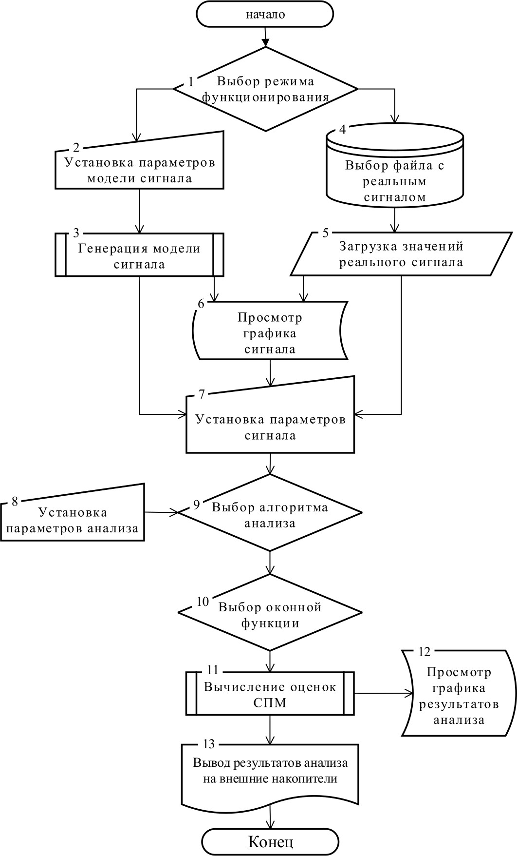 После запуска приложения осуществляется выбор режима функционирования (Блок 1). Для модели сигнала необходимо задать гармонические компоненты и их параметры: амплитуду, частоту и фазу (Блок 2). Опционально можно задать параметры шума сигнала. Этап генерации модели сигнала (Блок 3) может быть инициирован во время просмотра графика сигнала (Блок 6) по запросу «Просмотреть», а также во время вычисления оценок СПМ (Блок 11). Генерация координат модели сигнала (Блок 3) происходит параллельно для отдельных его фрагментов. Так, например, первая и вторая половины графика будут вычислены на разных процессорах, что позволит повысить быстродействие. Для реального сигнала необходимо выбрать файл с данными в формате *.csv или *.xlsx (Блок 4). После загрузки реального сигнала (Блок 5) можно просмотреть загруженные данные в виде графика (Блок 6). Далее производится установка параметров вспомогательного сигнала (Блок 7). Для вспомогательного сигнала необходимо ввести амплитуду, частоту и фазу. Подсчет координат графика будет аналогично произведен параллельно для каждой его части. После установки параметров анализа (Блок 8) можно произвести сам анализ введенного сигнала по выбранному алгоритму (Блок 9). Затем необходимо выбрать оконную функцию (Блок 10). Некоторые фрагменты алгоритма, такие как подсчет разницы введенного и вспомогательного сигнала, последовательно независимые массивы данных, подсчет результирующих амплитуд, фазовых спектров и нормированных величин, производятся параллельно. После выполнения процедуры вычисления оценок СПМ (Блок 11) можно просмотреть график результатов анализа (Блок 12), который аналогично модели сигнала вычисляется параллельно, и сохранить результаты на внешние накопители (Блок 13). Выходными данными программы являются дискретные значения оценки спектральной плотности мощности, а также их нормированные значения в относительных единицах и децибелах. Для вывода результатов вычислений используются табличные и графические способы.