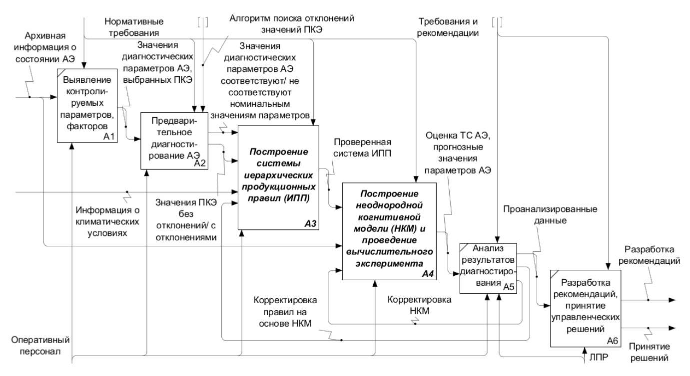 Автором предложен подход к диагностированию АЭ на основе иерархических функциональных моделей с использованием методологии IDEF0, учитывающий влияние основных диагностических параметров, ПКЭ дополнительно к традиционным диагностическим показателям АЭ.