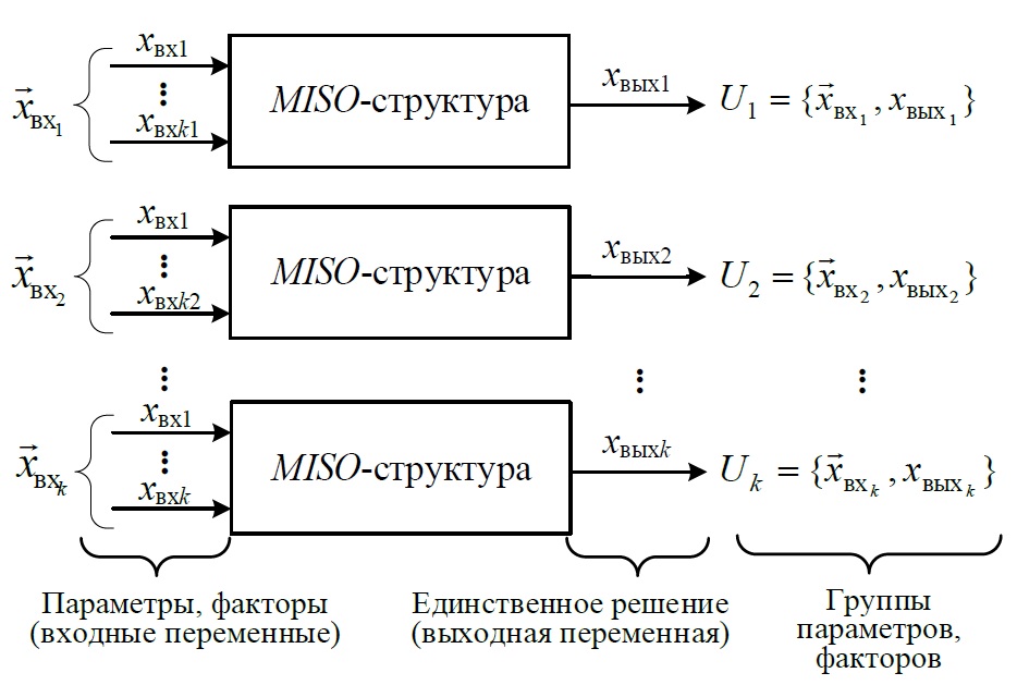 Поскольку в рассматриваемом случае на ТС АЭ влияют множество групп параметров, факторов (входные переменные), а в качестве выхода выступает единственное решение (выходная переменная), то для разработки продукционных правил применяется MISO-структура (рис. 5).