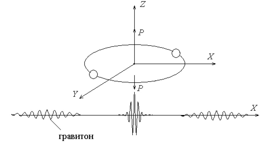 Будем полагать, что уравнение (49) описывает гравитационные волны и гравитон как квантовый эффект некоторой гравитационной волны, который распространяется в гравитационном поле другой излучающей гравитационные волны системы (рис. 2). Поэтому общее решение уравнения (49) будем искать в виде: