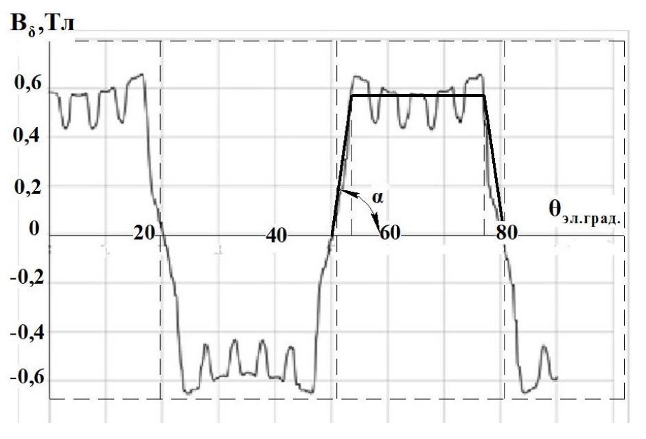 При выводе уравнений ИСГ необходимо иметь представление о характере распределения магнитного поля в зазоре. На рис. 1 приведена кривая распределения магнитной индукции в зазоре ИСГ, полученная в результате решения магнитостатической задачи методом конечных элементов, и аппроксимирующая ее на одном полюсном делении равнобокая трапеция. Как видно из рисунка, магнитная индукция Вd в воздушном зазоре ИСГ с возбуждением от ПМ распределена трапецеидально и может быть в первом приближении аппроксимирована гладкой трапецией.
