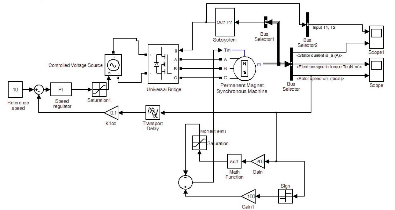 При эксплуатации ИСГ наиболее распространенным режимом является его прямое включение при пуске ДВС [13]. При прямом пуске статорные обмотки ИСГ через инвертор подключаются на полное напряжение питания. Прямой пуск ДВС неблагоприятен для источника питания – АБ, при ограниченной емкости которой напряжение в ней падает на (30–40 %), что нарушает работу других потребителей. К недостаткам прямого пуска следует также отнести нерациональный расход емкости АБ из-за значительной неравномерности тока, низкий КПД (до 35 %). Предложенный авторами регулируемый запуск [14] устраняет перечисленные недостатки и при этом дополнительно обеспечивает выбор люфтов в редукторе коробке передач при небольшой начальной частоте вращения. В режиме регулируемого пуска ИСГ с системой управления образует одноконтурную скоростную систему автоматического регулирования [15].