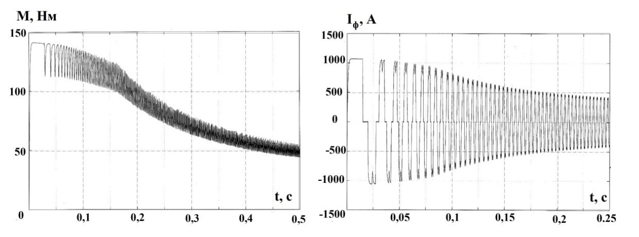Переходные процессы по электромагнитному моменту и току фазы статора ИСГ в замкнутой системе регулирования скорости с ограничением пускового тока приведены на рис. 5. Анализ осциллограмм процесса пуска показывает, что время достижения той же частоты вращения при ограничении пускового тока на 0,15 с больше, чем без ограничения пускового тока, и составляет 0,65 с, что в целом удовлетворяет требованиям, предъявляемым к времени запуска ДВС электропусковыми системами транспортных средств. При этом значение пускового тока, протекающего через инвертор и фазы обмотки статора ИСГ, не превышает допустимого значения Iдоп = 1000 А.