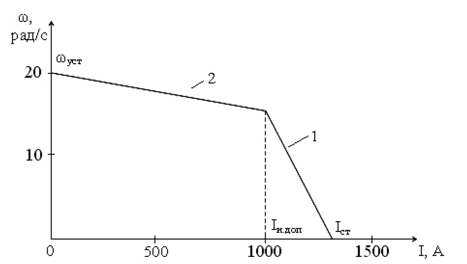 Рис. 4. Электромеханическая характеристика ИСГ при запуске ДВС с ограничением тока: ωуст=20 рад/с (n=200 мин-1); Iи.доп=1000 А