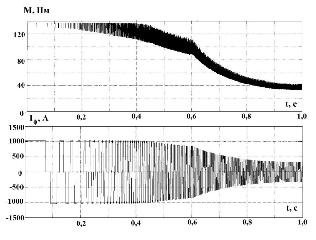 Рис. 5. Электромагнитный момент и ток фазы статора в системе с ограничением тока