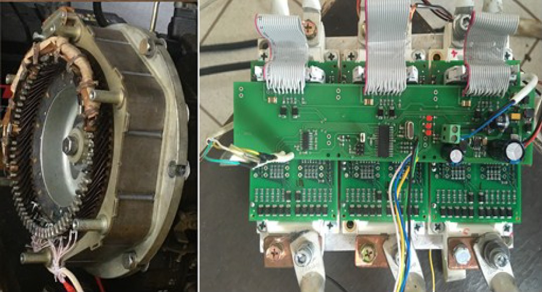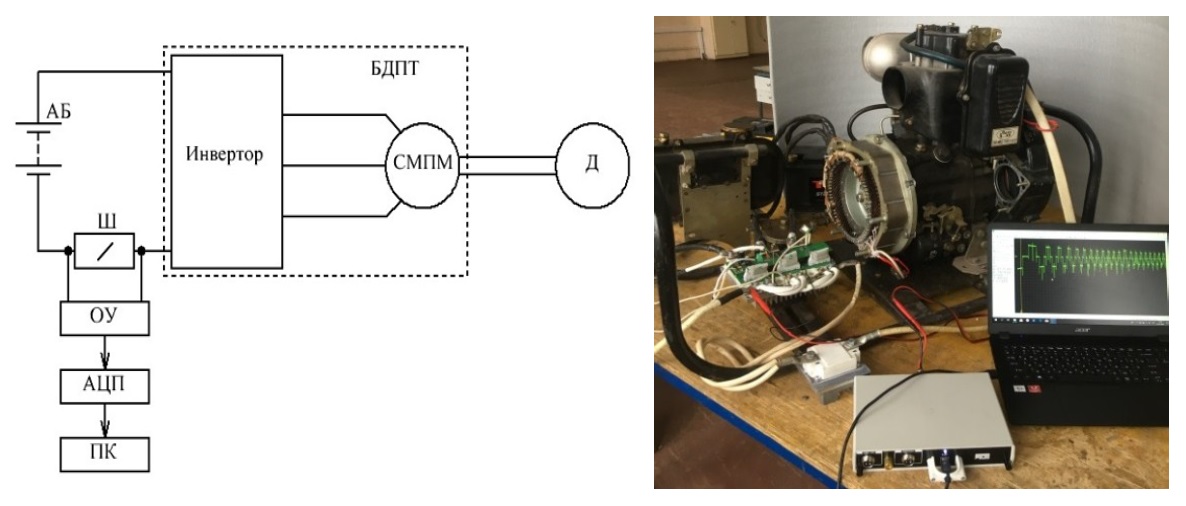 С целью проверки и подтверждения адекватности математической модели, полученной выше, были проведены экспериментальные исследования работы ИСГ в стартерном режиме (режим прокрутки дизельного двигателя). Структурная схема экспериментальной установки для измерения тока инвертора и испытательный стенд для исследования стартерного режима работы ИСГ показаны на рис. 7.