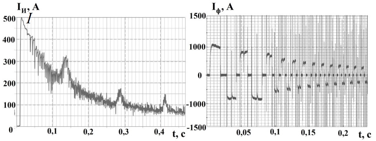 В процессе пуска ДВС производилась регистрация потребляемого ИСГ от инвертора тока и фазного тока статора. Осциллограммы указанных токов приведены на рис. 8. В эксперименте реализована система запуска без ограничения тока.