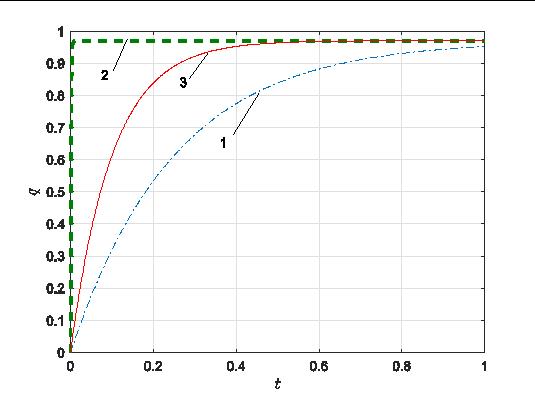В данном модельном примере искомые значения параметров были приняты следующими: , временной интервал соответствовал предыдущему случаю. На основе априорной информации об экспоненциальной зависимости искомой плотности теплового потока выбраны границы интервала изменения параметра как предельные значения, определяющие требуемый характер зависимости на заданном временном интервале (рис. 1). В случае зависимость (6) на интервале не выходит на установившееся значение, а при участок изменения является столь малым, что им можно пренебречь и искать в классе постоянных функций. В зависимости от интенсивности помехи полученный диапазон был поделен с использованием шага дискретизации от до , на основе чего был сформирован входной массив значений и соответствующих им температурных распределений для обучения второй ИНС. Начальное приближение выбрано равным 10. Характер кривых для всех трех случаев показан на рис. 1.