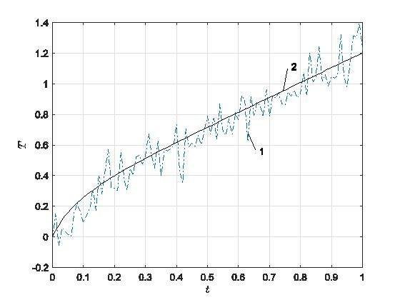 Рис. 3. Зашумленная температурная кривая при , используемая в качестве экспериментальной информации – (1), и полученное модельное распределение – (2)