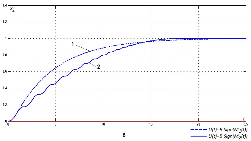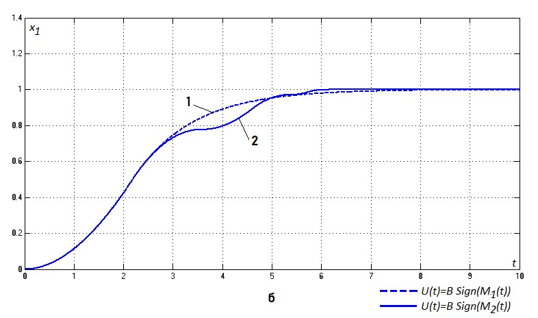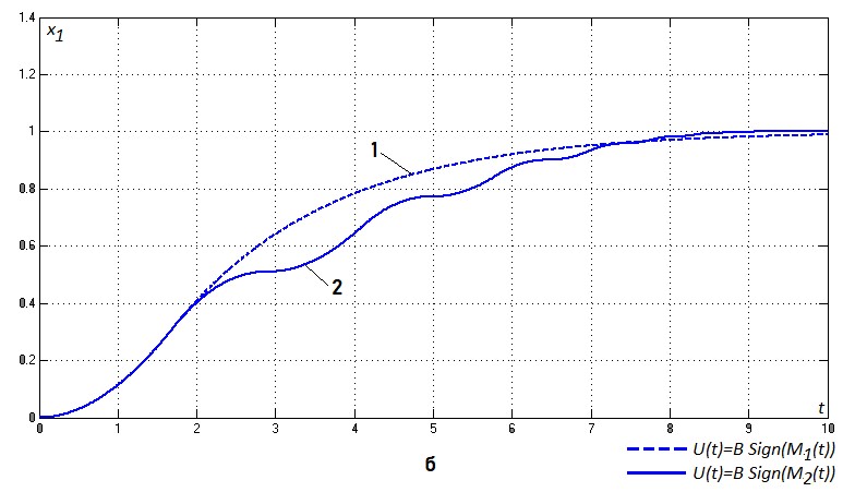На рис. 9а видны переключения релейного элемента в скользящем режиме при управлении (2). Высокочастотные переключения релейного элемента начинаются после первого же переключения, и график переходного процесса сливается в сплошную полосу. На рис. 9б видно, что при использовании в законе управления функции переключения (3) постоянные высокочастотные переключения релейного элемента отсутствуют, поэтому дополнительных алгоритмов для предотвращения этих колебаний вводить не требуется. При этом следует помнить, что в установившемся режиме высокочастотные колебания присутствуют как при управлении (2), так и при управлении (3). Однако эти колебания легко устраняются введением простой зоны нечувствительности.