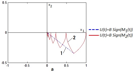 Здесь Р – регулятор, ОУ – линейная часть объекта управления, В – величина управляющего воздействия («полка» реле), sign() – знаковая функция, принимающая значения +1 или -1. x0 – задающее воздействие, х1 – регулируемая координата, U – управляющее воздействие.