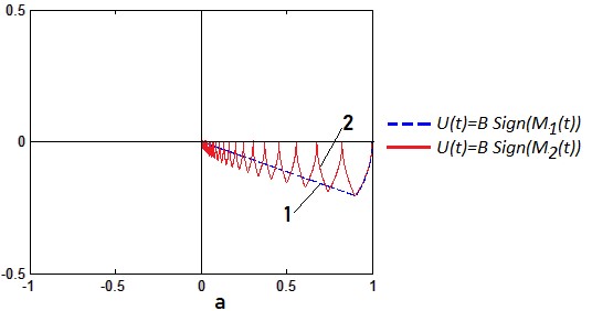 Из полученных результатов моделирования видно, что переходный процесс в случае использования управления (3) близок к монотонному. Длительность переходного процесса в случае квазискользящего режима практически не отличается от такового в скользящем режиме (не более 3 %). При этом отсутствует необходимость дифференцирования выходной координаты, как и любых других вычислений, связанных с реальным временем, что существенно упрощает (а следовательно, и удешевляет) управляющее устройство. Кроме того, в отличие от скользящего режима, в процессе управления отсутствуют переключения релейного элемента с бесконечной частотой и связанная с этим необходимость использования дополнительных алгоритмов, предохраняющих от поломок реальные управляющие устройства. На рис. 9 представлены результаты моделирования управляющего воздействия U(t) для модели, переходные процессы которой представлены на рис. 8.