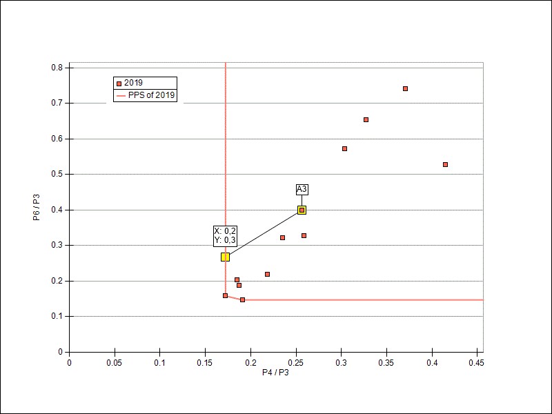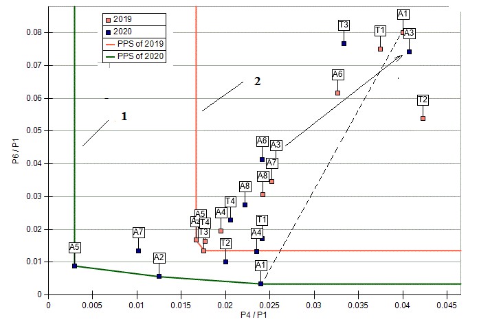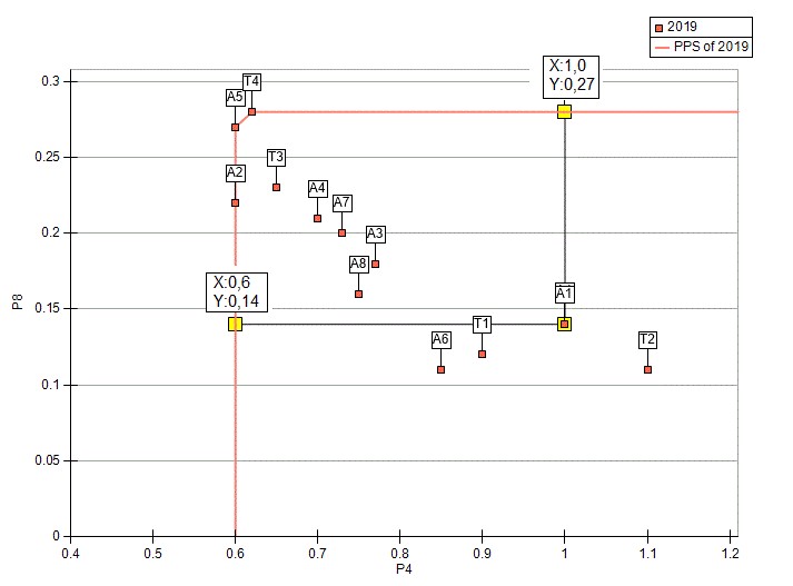 Графический интерфейс программы PIM DEASoft позволяет визуально оценивать положение объектов относительно границы эффективности. На рис. 3 показана диаграмма PPS (Production Possibility Set) – множество производственных возможностей в пространстве параметров Р4 и Р8. Для достижения границы эффективности автомобилем А1 в результате технического обслуживания в 2020 году должны измениться параметры: