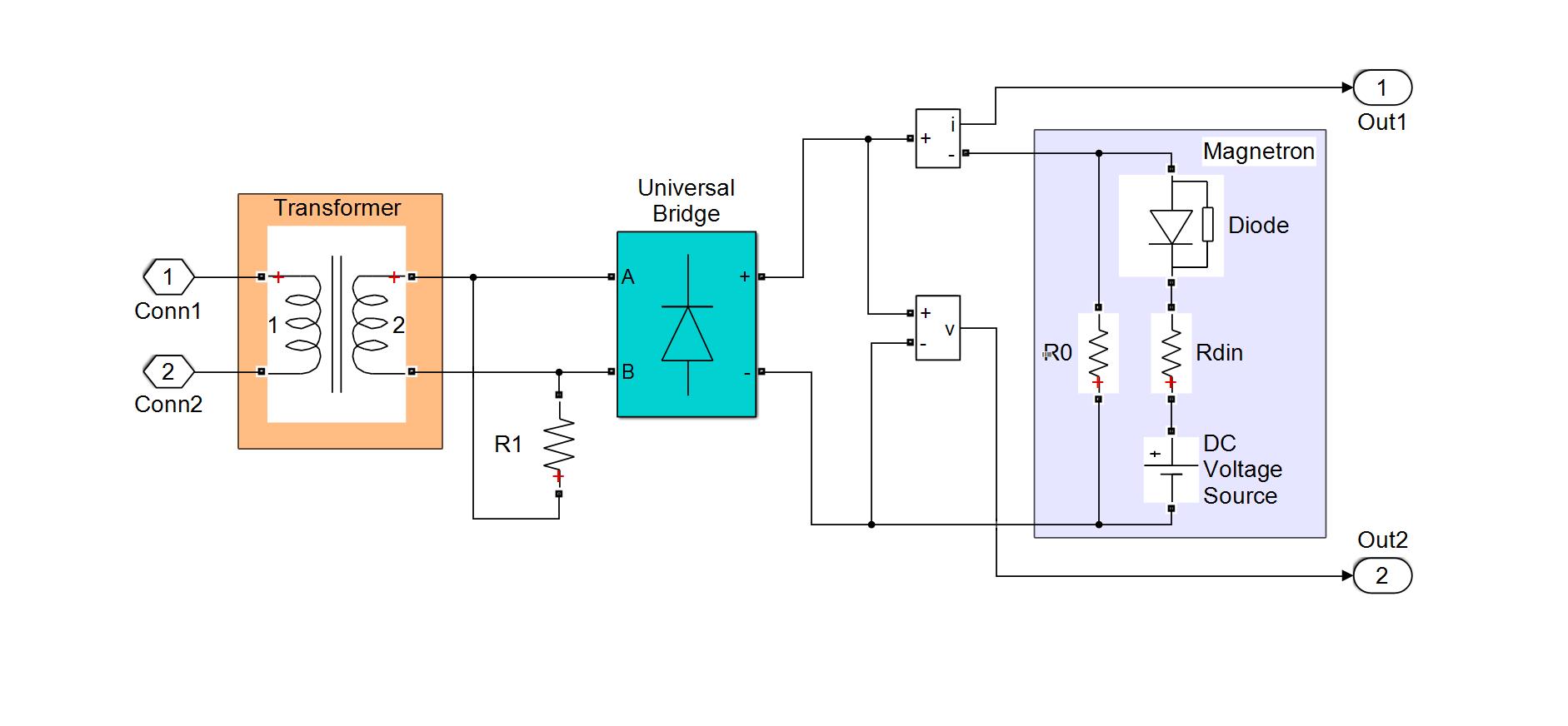 Магнетронные генераторы представлены субсистемами Magnetron Generator (рис. 3), в состав которых входят блоки, моделирующие пакетированный магнетрон с источником анодного напряжения.