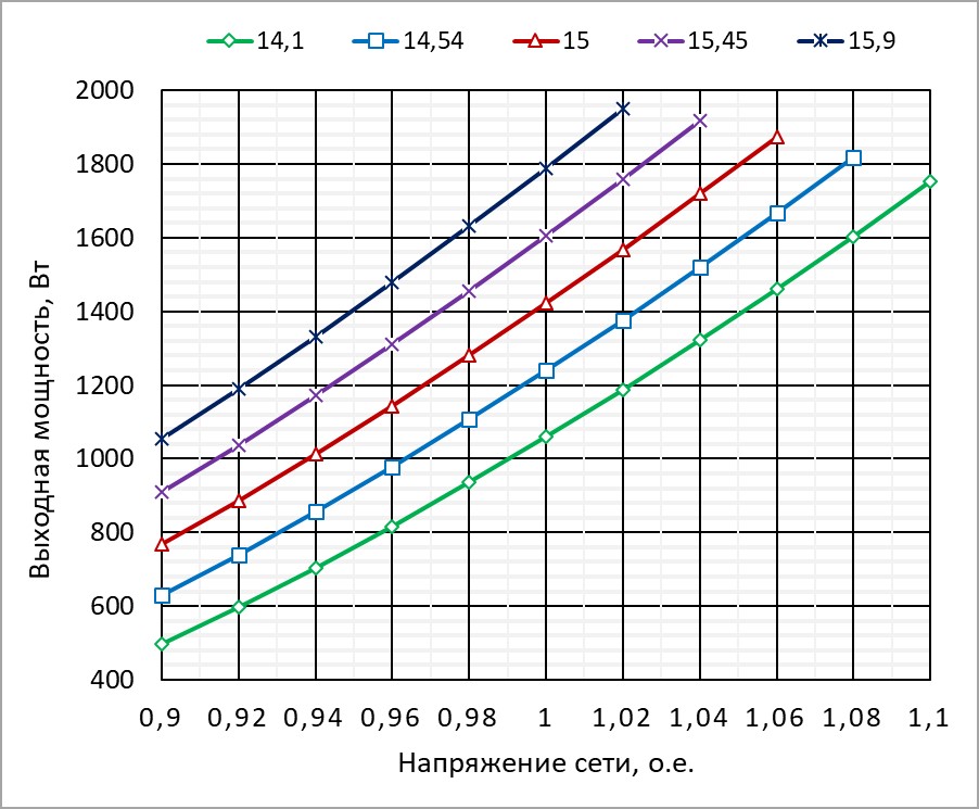 Рис. 4. Зависимость выходной мощности магнетрона от напряжения сети