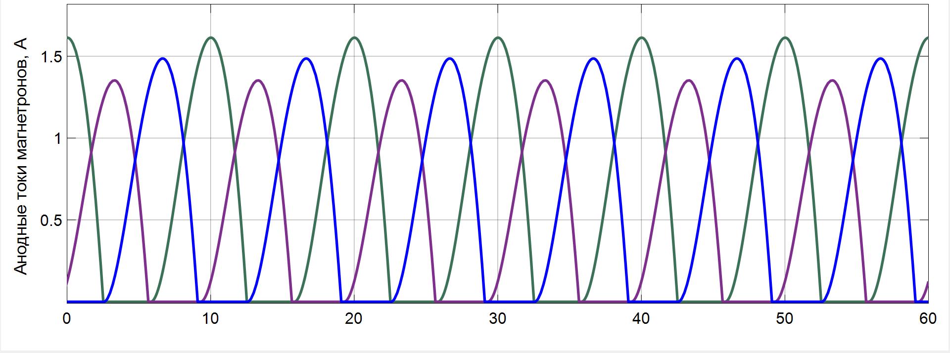 Осциллограммы анодных токов магнетронов для смоделированной ситуации с несимметрией напряжений показаны на рис. 5.