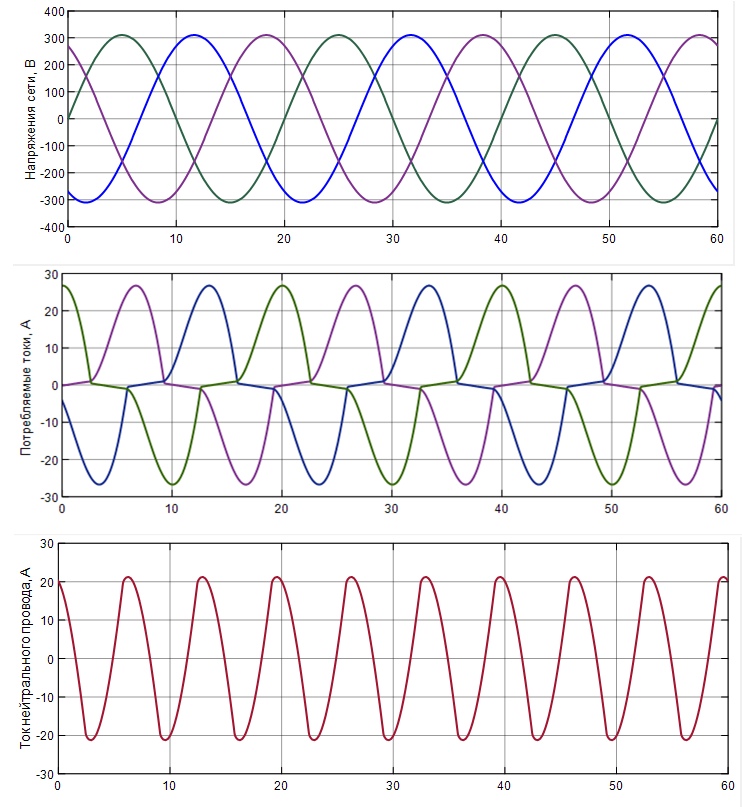 Наличие третьей гармоники в потребляемых токах приводит к тому, что по нейтральному проводу протекает ток, частота которого равна 150 Гц, а действующее значение соизмеримо с действующим значением линейных токов. Для рассмотренного примера моделирования действующие значения потребляемых токов составили 12,8 А. Ток нейтрального провода достиг значения 15 А.