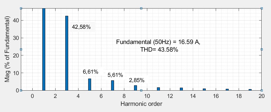 С помощью встроенного в MATLAB инструмента FFT (быстрое преобразование Фурье) произведен гармонический анализ кривой тока, потребляемого из сети (рис. 7). Результаты анализа показали, что наиболее интенсивной является третья гармоника. Для рассмотренного варианта моделирования системы электропитания она составила 42,58 % относительно первой гармоники. Суммарный коэффициент гармонических составляющих потребляемого тока равен 43,58 %.