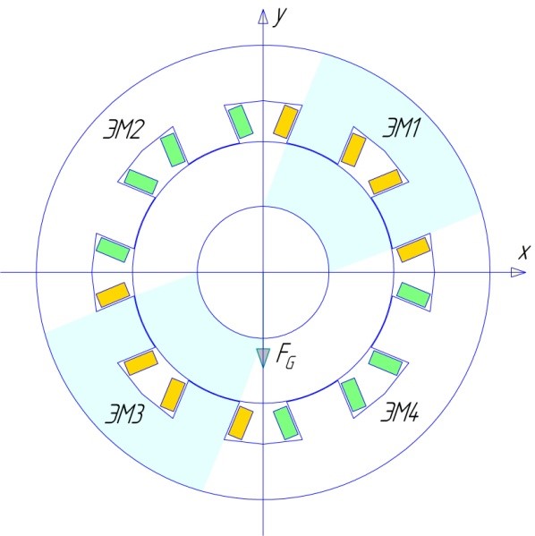 На рис. 1 FG – вес ротора, основная возмущающая сила, действующая на ротор АЭМП; ЭМ1, ЭМ2, ЭМ3 и ЭМ4 – независимые электромагниты, управляемые посредством широтно-импульсной модуляции (ШИМ) системы управления магнитным подвесом. Обычно оси электромагнитов смещены в пространстве таким образом, чтобы распределить вес ротора между двумя соседними электромагнитами (ЭМ1 и ЭМ2). Электромагниты, лежащие на одной оси (например ЭМ1 и ЭМ3), объединяются в один канал управления.