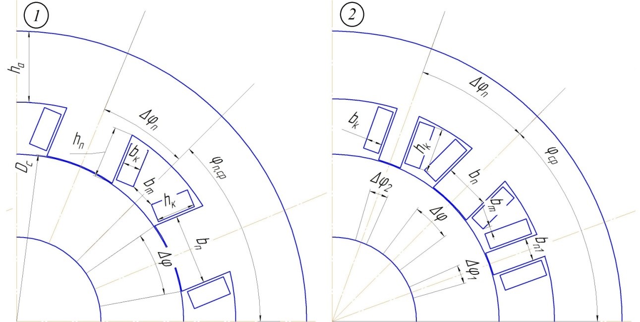 Длина дуги воздушного зазора, занимаемая управляющими полюсами, может быть предварительно рассчитана на основании требуемой ширины полюсов, катушек и технологических зазоров. Основные геометрические размеры Побразной и Ш-образной конструкций представлены на рис. 2.