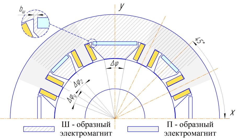 Таким образом, для обеспечения полюсами управления тяговой силы по (3) в заданных габаритах один (из четырех) электромагнит займет угол Δφem = 36о, оставляя 54о на полюса с возбуждением потока от постоянных магнитов на сегмент в четверть окружности по расточке статора.