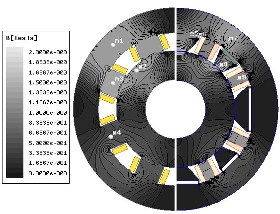 Картина магнитного поля соответствует случаю, когда радиальный АЭМП развивает номинальную тяговую силу. На рис. 4 и в таблице представлена магнитная индукция в ключевых точках машины. Для сравнения представлены две конструкции радиального АЭМП: исходная и конструкция с закладными магнитами. Магнитное состояние подшипника, рассчитанного по методике, представленной выше, соответствует ожиданию. Магнитная индукция в теле магнита Bm = 1,1 Тл, в зазоре под полюсами ПМ Bp = 1,6 Тл, индукция в зубцах управляющих полюсов Bc.t = 1,1 Тл в «верхних» полюсах и Bc.u = 1,26 Тл в «нижних» соответствует линейному участку кривой намагничивания стали 2412. Наиболее «узким» местом конструкции с ПМ в отношении магнитного состояния оказалось ярмо на участке между полюсами ПМ: Вbp = 1,48 Тл, что соответствует колену на кривой намагничивания, что связано со спецификой рассматриваемой конструкции: магнитные потоки управляющих полюсов и полюсов ПМ в этом месте складываются. Индукция в технологических мостиках превышает Вbs > 2 Тл, что соответствует глубокому насыщению используемой стали. Коэффициент рассеяния ПМ большого и малых полюсов соответственно при рассчитанных габаритах определялся отношением потока в среднем сечении магнита к потоку в зазоре:
