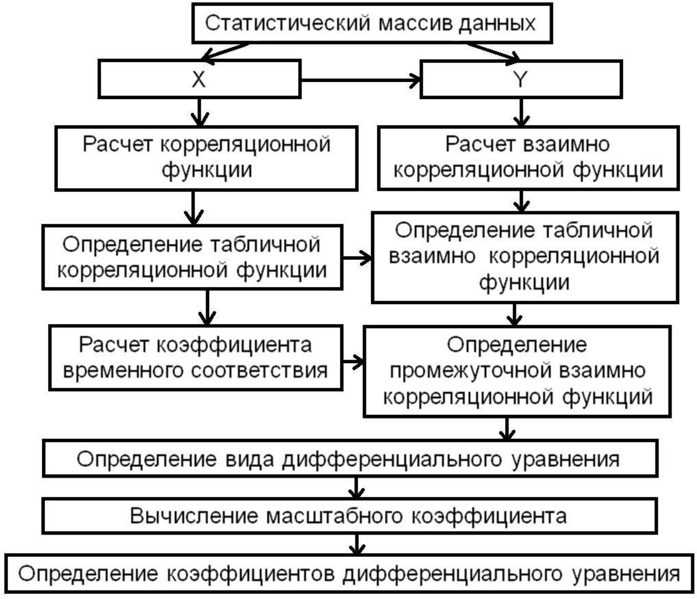 - Выбранный метод позволяет с использованием экспериментально определенных корреляционных функций на основе статистической информации и с помощью библиотеки типовых линейных моделей [24] найти импульсную переходную характеристику системы [24–27]. На рис. 1 представлен алгоритм структурно-параметрической идентификации. По известным статистическим данным определяются экспериментальные автокорреляционные и взаимные корреляционные функции и .