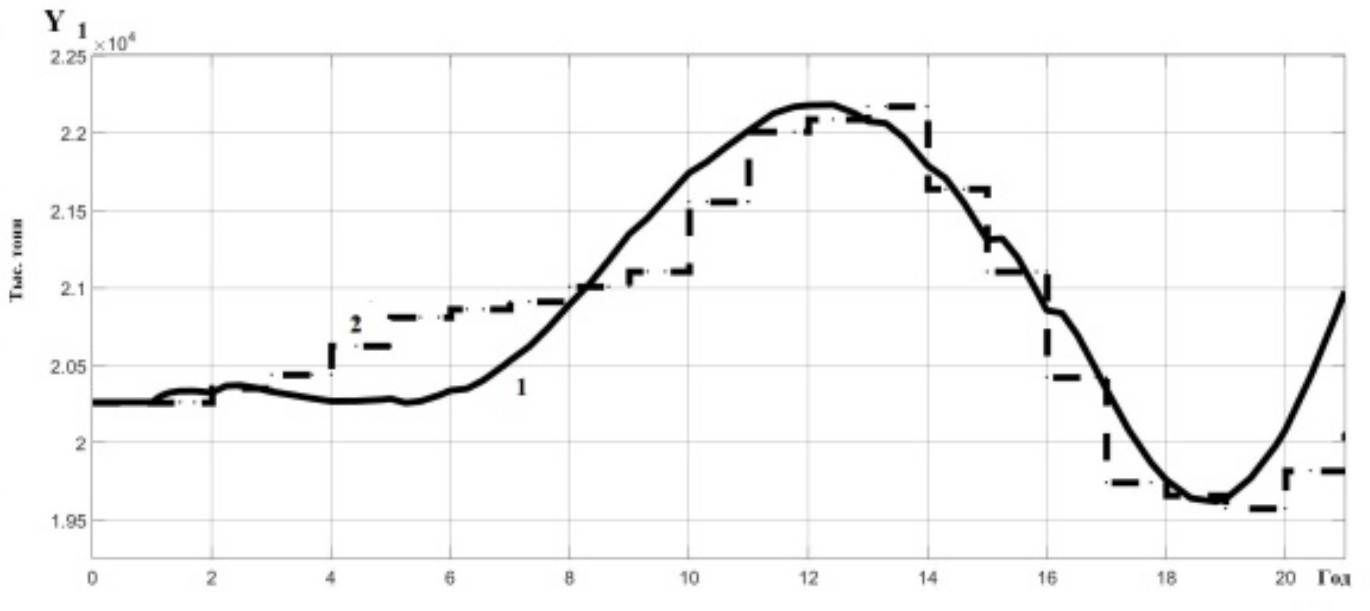 Рис. 2. Модельные (1) и статистические данные (2) Y1