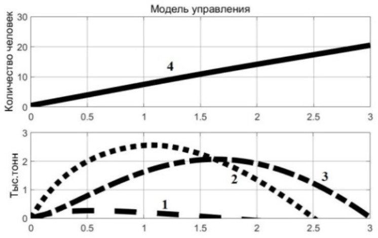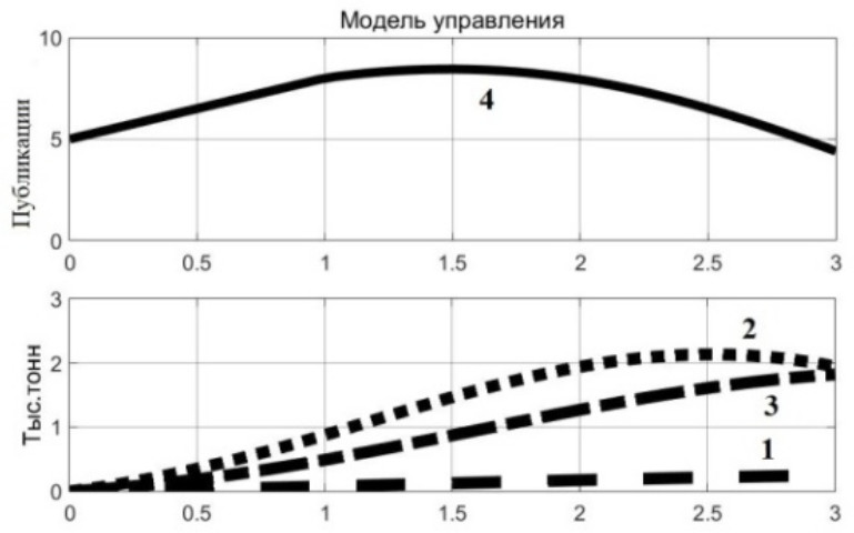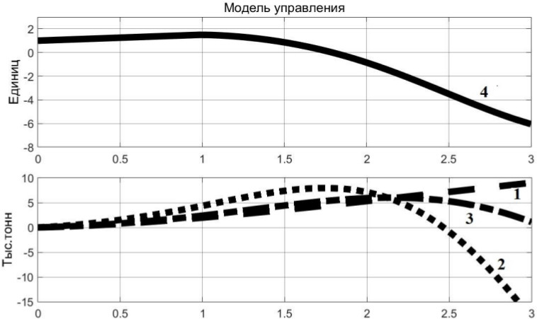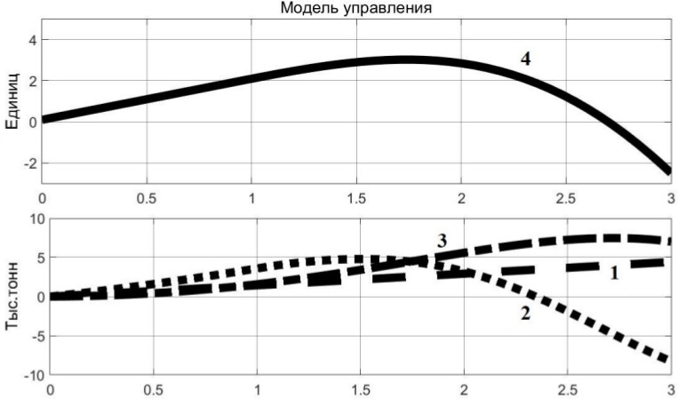 Анализ результатов моделирования (рис. 4) демонстрирует возможности управления. Обеспечивается рост объема нефти, поступившей на переработку (кривые 2, 3), по сравнению с нерегулируемой траекторией (кривая 1). Для увеличения роста объема нефти, поступившей на переработку, будем использовать кривые с более длительным ростом.