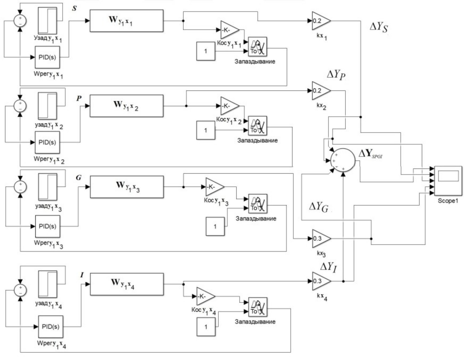 Рассмотрим суммарное влияние на отраслевые показатели эффективности нефтяной промышленности Самарской области всех четырех показателей деятельности СамГТУ при значениях весовых коэффициентов , , , , которые содержат в скрытой форме затраты на соответствующую часть кадрового обеспечения. Проблема определения этих коэффициентов решается известными методами (МАИ, DEA) [30]. Схема моделирования алгоритма управления показателем эффективности по-му входу в программном пакете Simulink в среде MATLAB представлена на рис. 8.