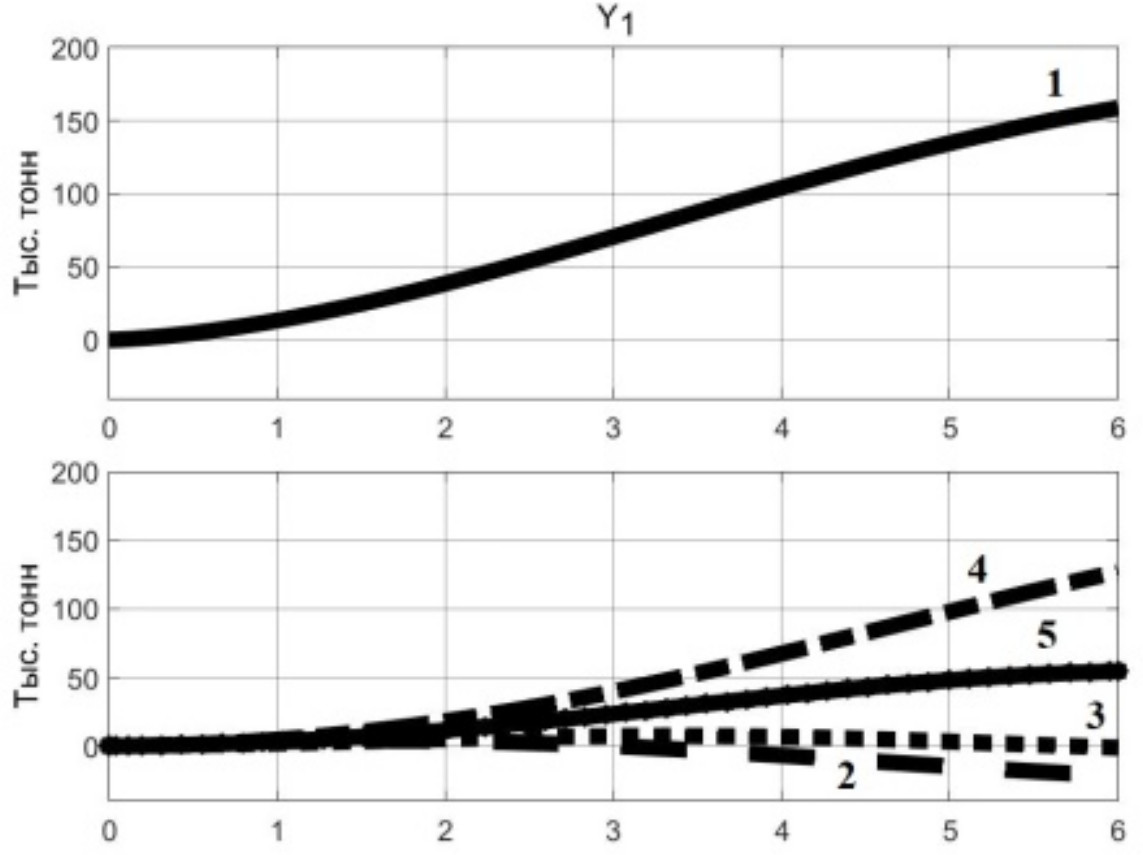 На рис. 9 представлен график роста показателя объема нефти, поступившей на переработку , при совместном воздействии входных величин (кривая 1), (кривая 2), (кривая 3), (кривая 4) и (кривая 5).