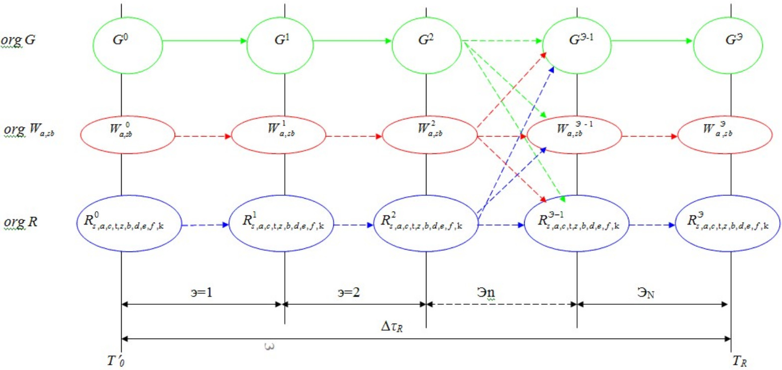 В зависимости от вариантов детального плана в условиях космического полета АКА присутствуют постоянные входные воздействия на процессы в БС, приводящие к изменению показателей равномерности и интенсивности выработки ресурсов систем [21]. Управление ресурсами бортовых систем АКА на этапах, , , для наглядности представлено в виде линейных ориентированных графов (орграфов – org) по числу компонент множества интегрального полетного ресурса (ИПР)