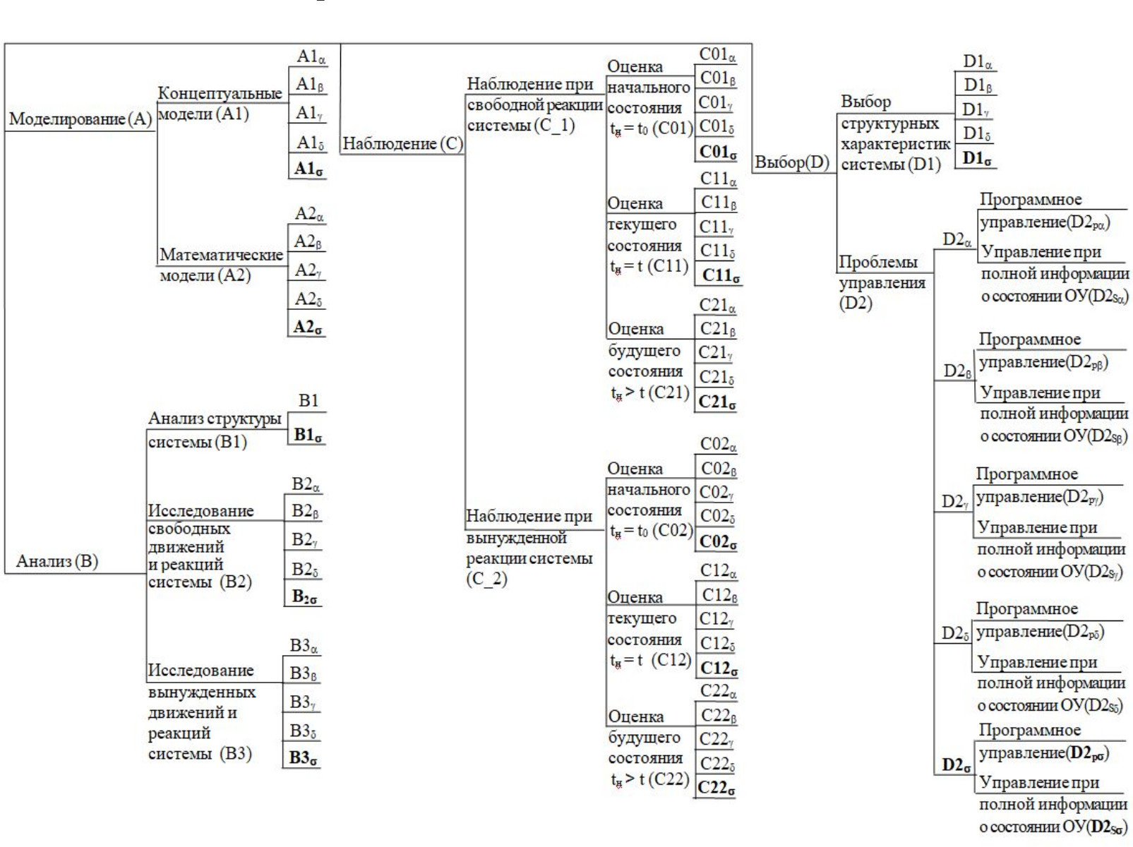 В.Н. Калининым, одним из основоположников школы системно-кибернетических исследований динамических систем в ВКА им. А.Ф. Можайского, проведен морфологический анализ проблематики системно-кибернетических исследований с учетом воздействия на системы управления четырех типов возмущающей среды: детерминированной (), стохастической (), целенаправленной () и с неизвестными характеристиками () [3]. Результаты исследований представлены в виде морфологического дерева с четырьмя ветвями, отображающими фундаментальные проблемы (моделирование – анализ – наблюдение – выбор), которые лежат в основе системно-кибернетических исследований, и листьями-задачами, решение которых на различных этапах жизненного цикла АКА позволяет обеспечить оптимальное управление сложными динамическими системами, включающее в себя и обеспечение надежности систем.