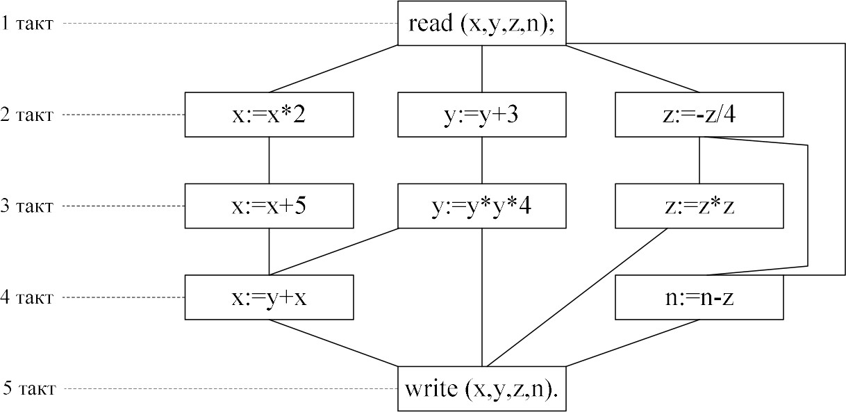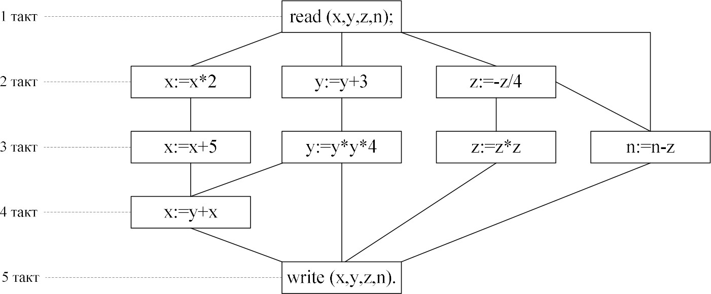 Количество тактов выполнения алгоритма снизилось с 10 до 5. Данное значение является минимумом, выполнить алгоритм за меньшее количество шагов не представляется возможным. Тем не менее здесь задействовано 4 вычислителя. Можно применить ЯПФ для оптимизации алгоритма (рис. 7).