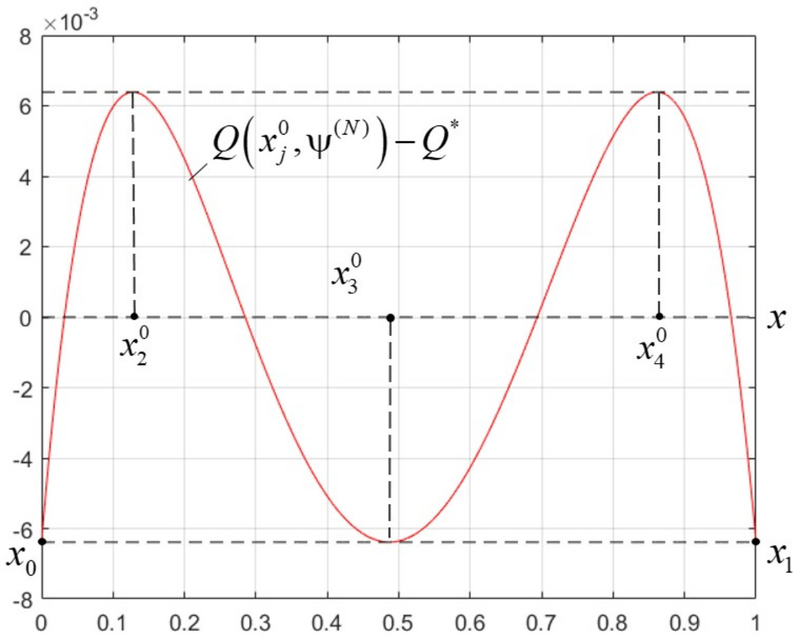 \frac{{\partial Q\left( {x_j^0,\psi _{}^{\left( N \right)}} \right)}}{{\partial x}} = 0,\,\,j = 2,3,4.